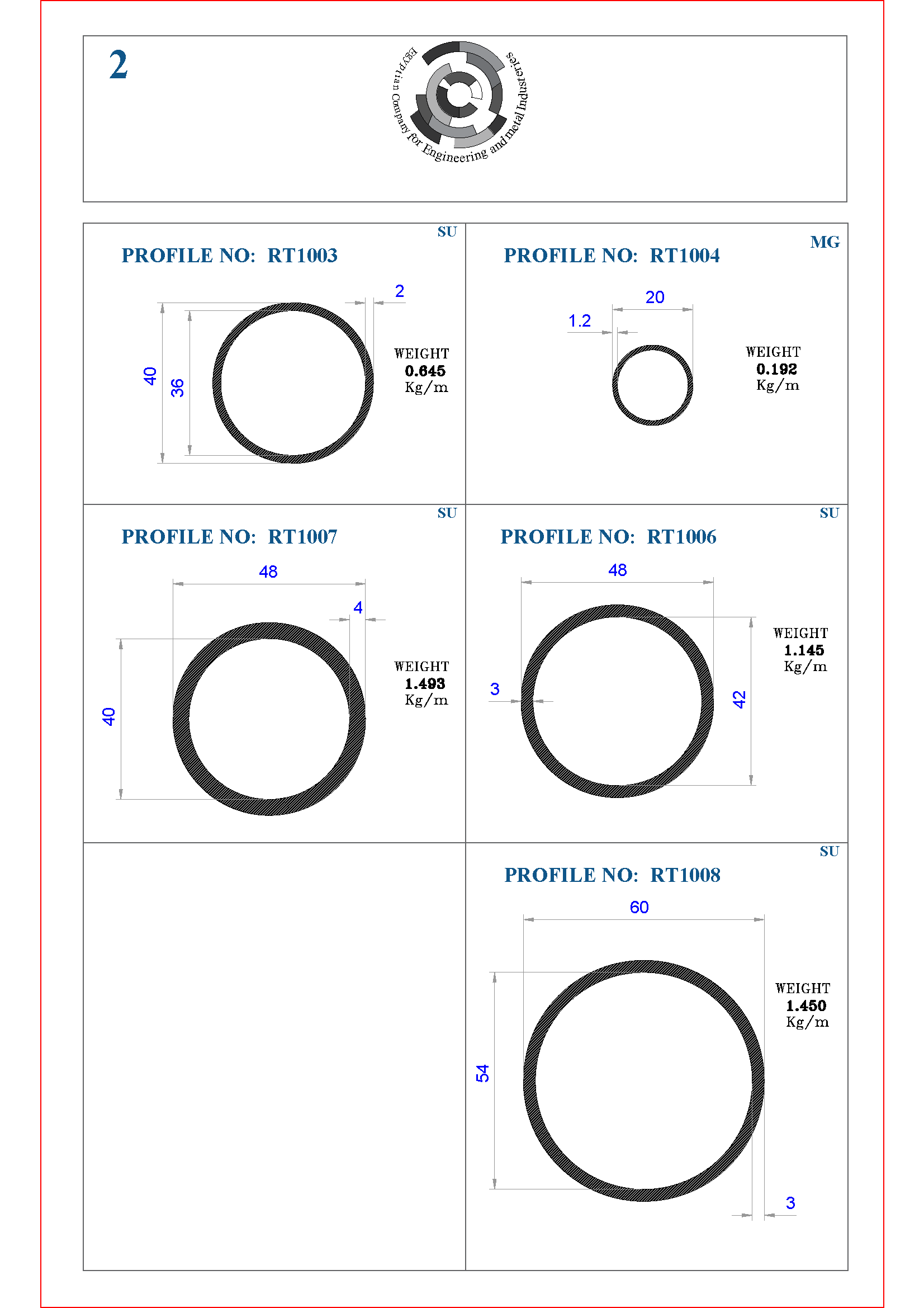 | Profile No. | Outer Diameter A (mm) | Inner Diameter (mm) | Thickness T (mm) | Weight (kg/m) |